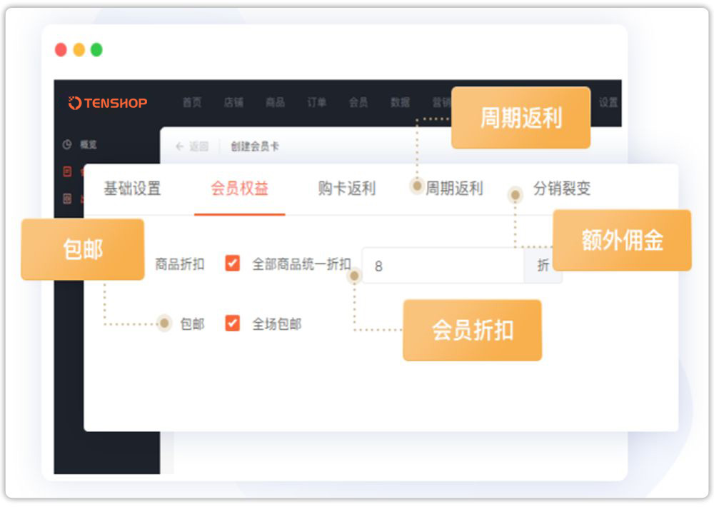 会员折扣、包邮、周期返利、额外佣金等多种权益设置,提升会员留存率。