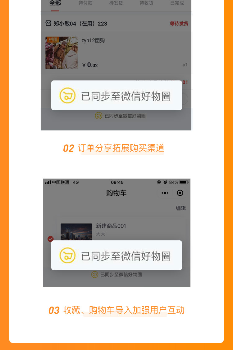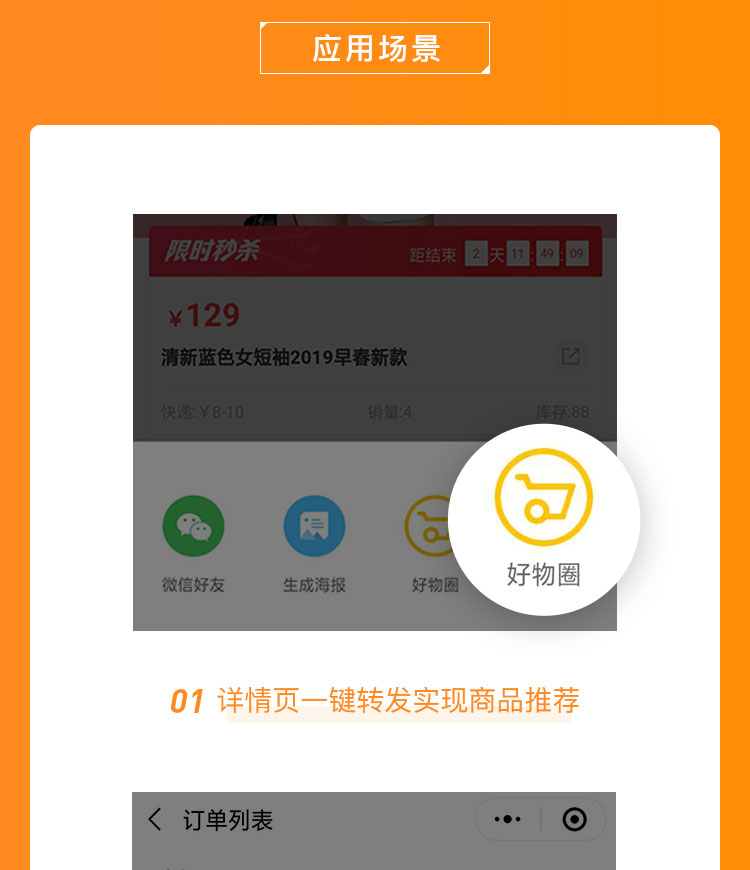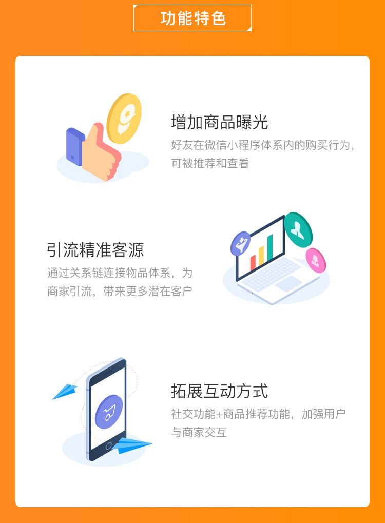 好物圈功能可一键打通小程序中各种订单,相当于专供用户推荐物品的“朋友圈”,这个“朋友圈”意味着曝光率,也意味着流量。小编建议各位老板们在开通好物圈之后,可以配合使用好友瓜分券、拼团、砍价等小程序裂变营销工具,提升用户留存度和活跃度,在增加订单与销量的同时,让商品能够更多的出现在“好物圈”,进而提高购买及复购率,抢占更多自然流量。
