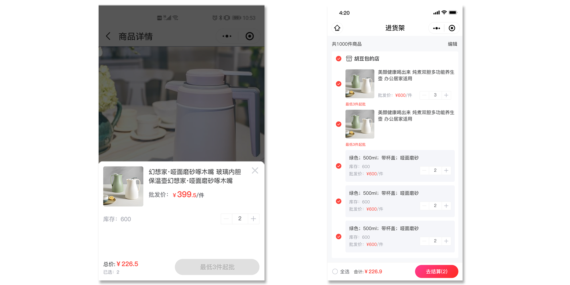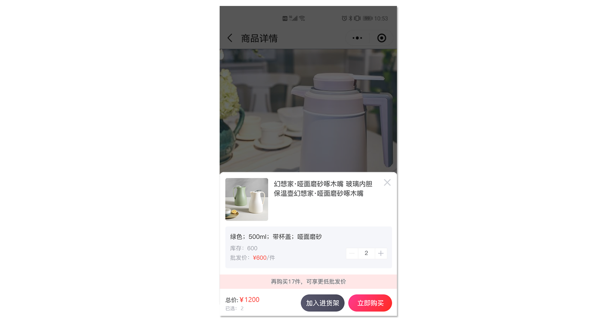 ·商品详情页和“进货架”都会显示阶梯优惠,引导用户多下单购买。