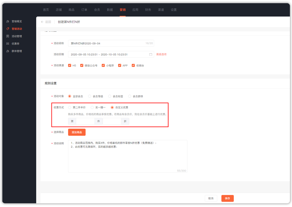 第N件打N折:商家可根据需求设置此营销活动,可设置第2件半价、买一赠一、自定义优惠等三种优惠方式。用户可叠加使用优惠,多买多优惠。