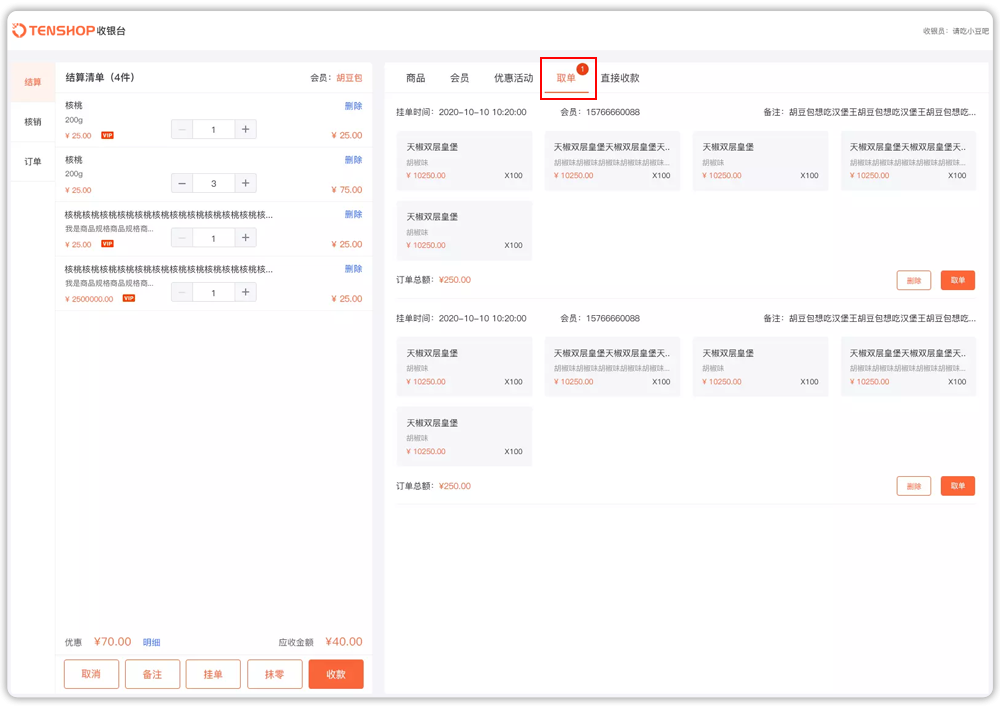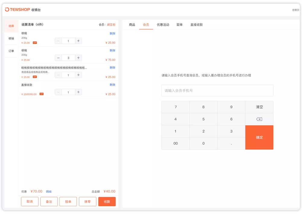 支持收银员开单时,通过输入手机号绑定会员信息,顾客可享受会员相关权益。