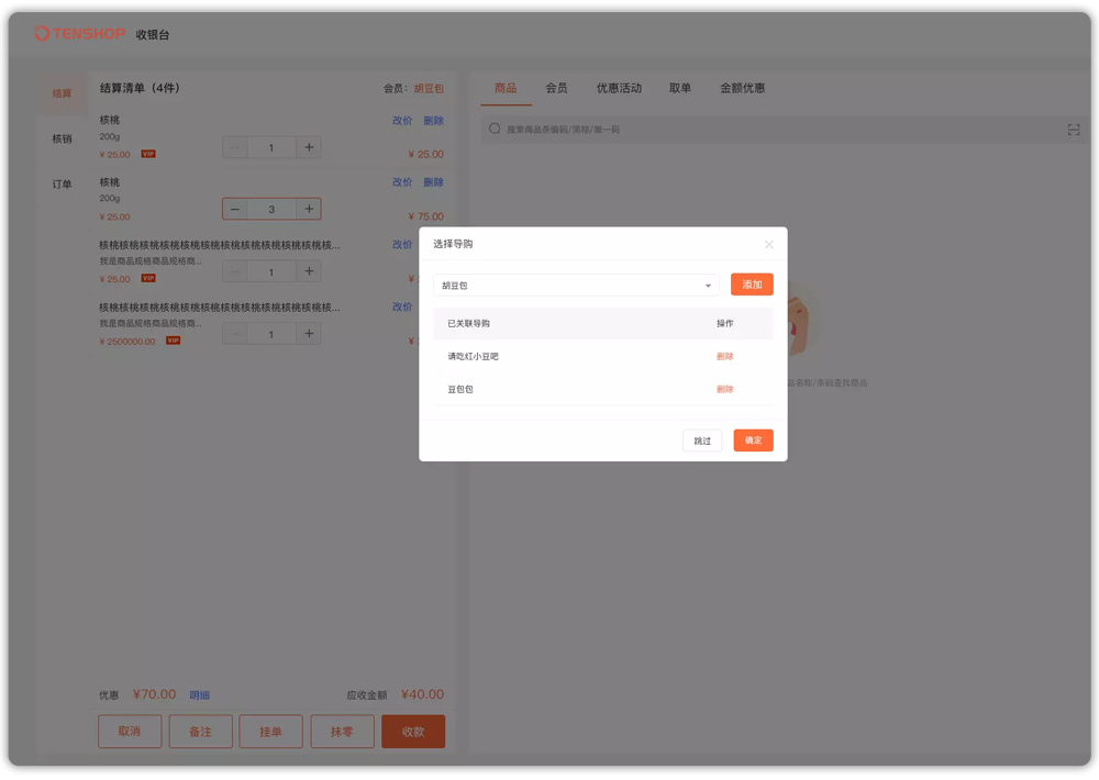顾客下单时支持选择导购,订单关联导购、收银员业绩,有助于提升员工积极性。