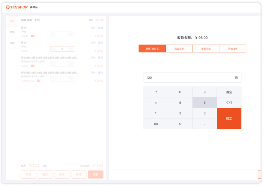 支持支付宝、微信、现金、余额、客户扫码等多种支付方式,满足顾客不同的支付体验。
