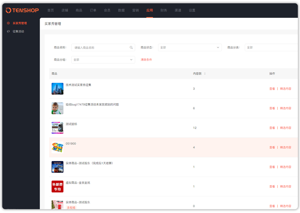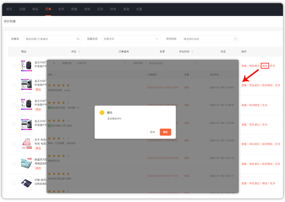 展示商品及对应的买家秀数量,商家可对评价进行筛选,展示精选内容,便捷管理所有买家秀内容。