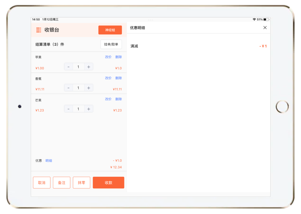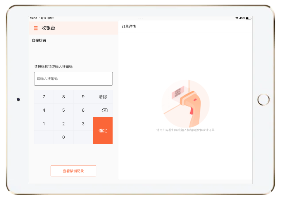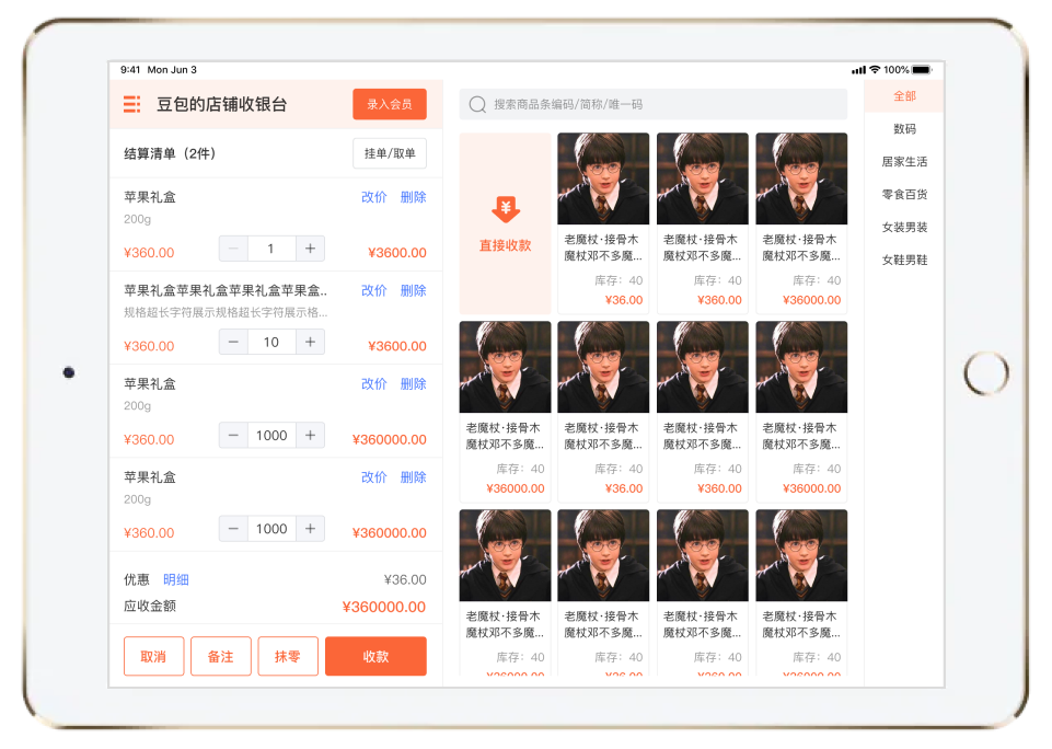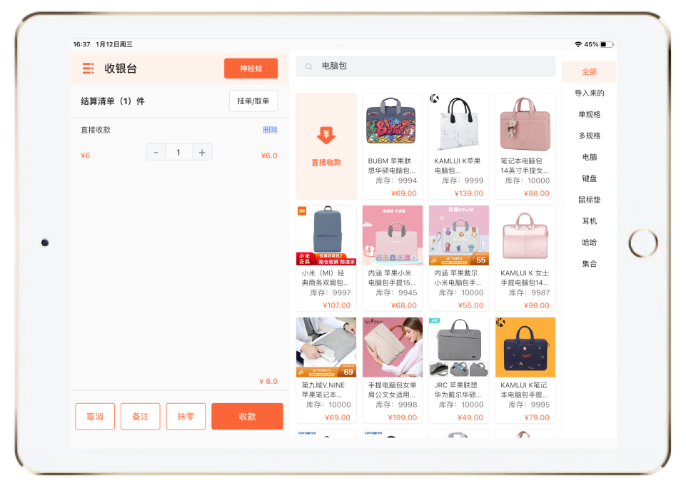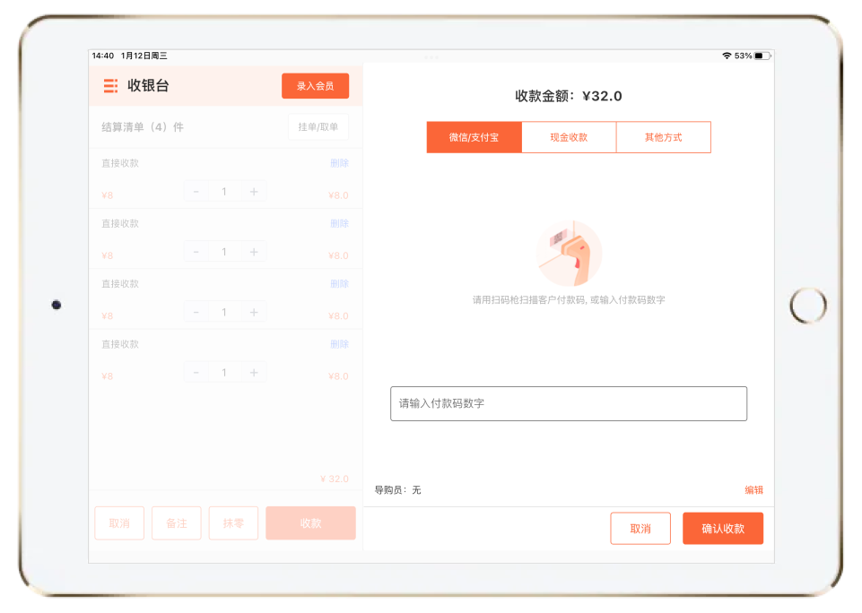 【5】结算时可以使用扫码枪扫描客户微信或支付宝付款码,以及余额支付、现金支付等支付方式。