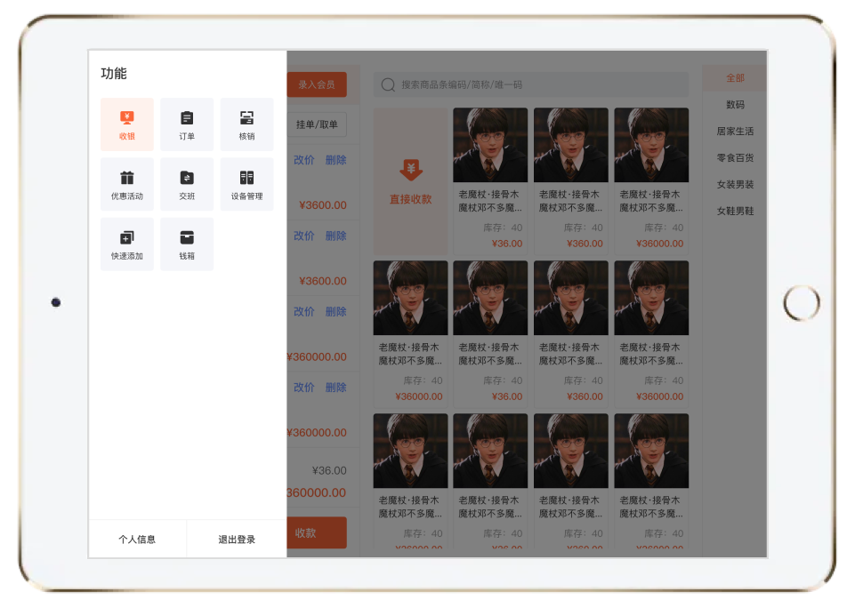 【11】支持对接收钱箱、扫码枪、打印机等硬件设备,并可自动弹出收钱箱。