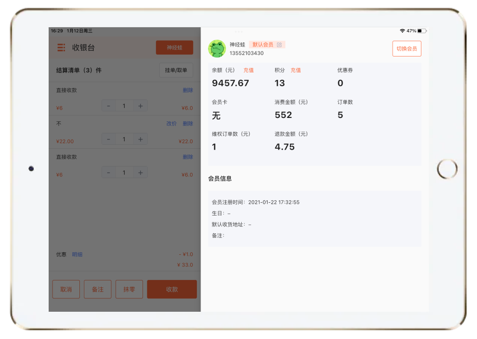 【4】结算时支持录入会员,并可通过手机号在线创建会员,并可在收银台给会员进行充值。