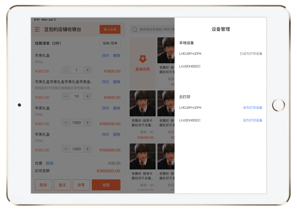 【9】支持收银员交班并可打印交班小票,可在设备管理处选择选用云打印机或者本地打印机进行打印。