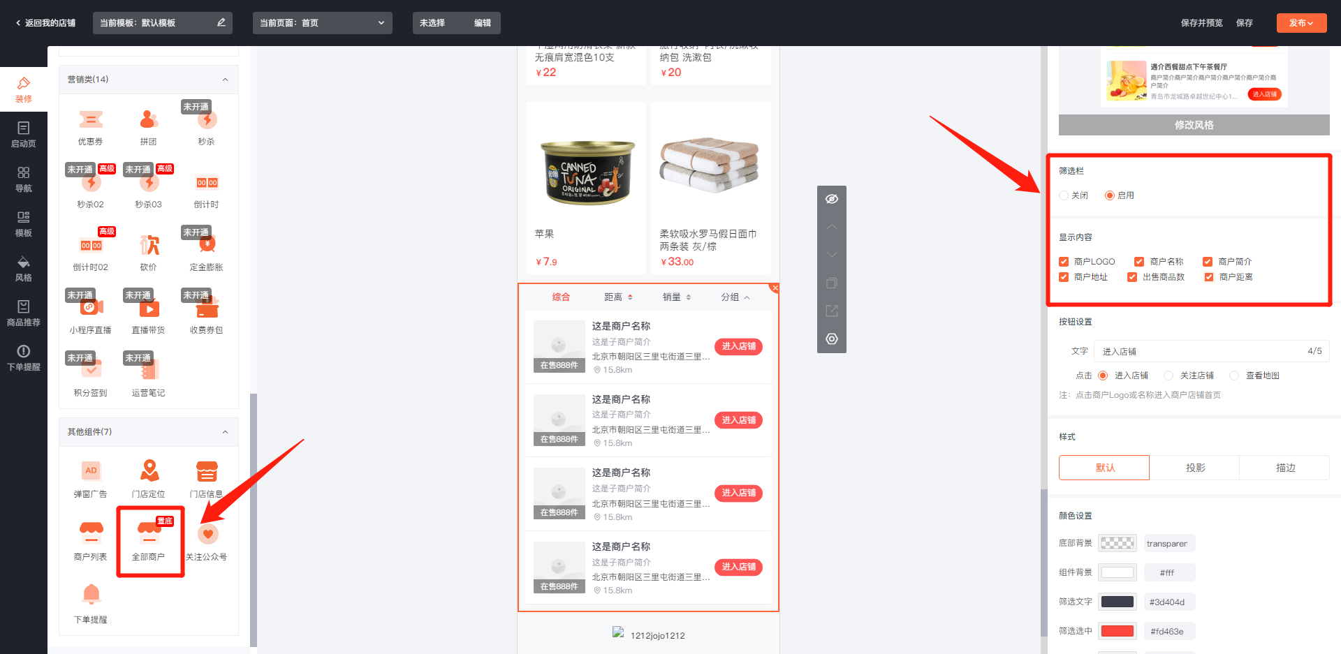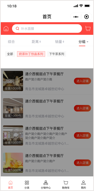 ▷启用筛选栏:提供按综合/距离/销量/分组的四种排序方式