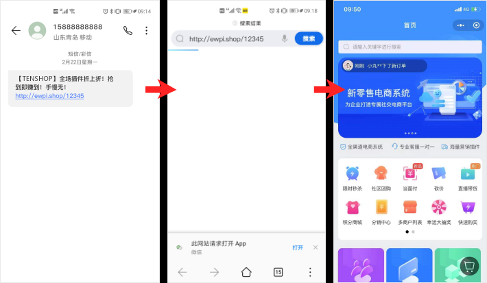 基于短信跳转小程序功能,商家可通过短信将赠券、优惠活动(拼团/秒杀/满减等)信息发送至会员手机,会员点击短信内的小程序链接即可直接跳转微信商城小程序页面,该应用可帮助商家快速实现客户激活,促进转化。