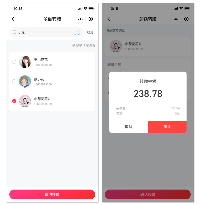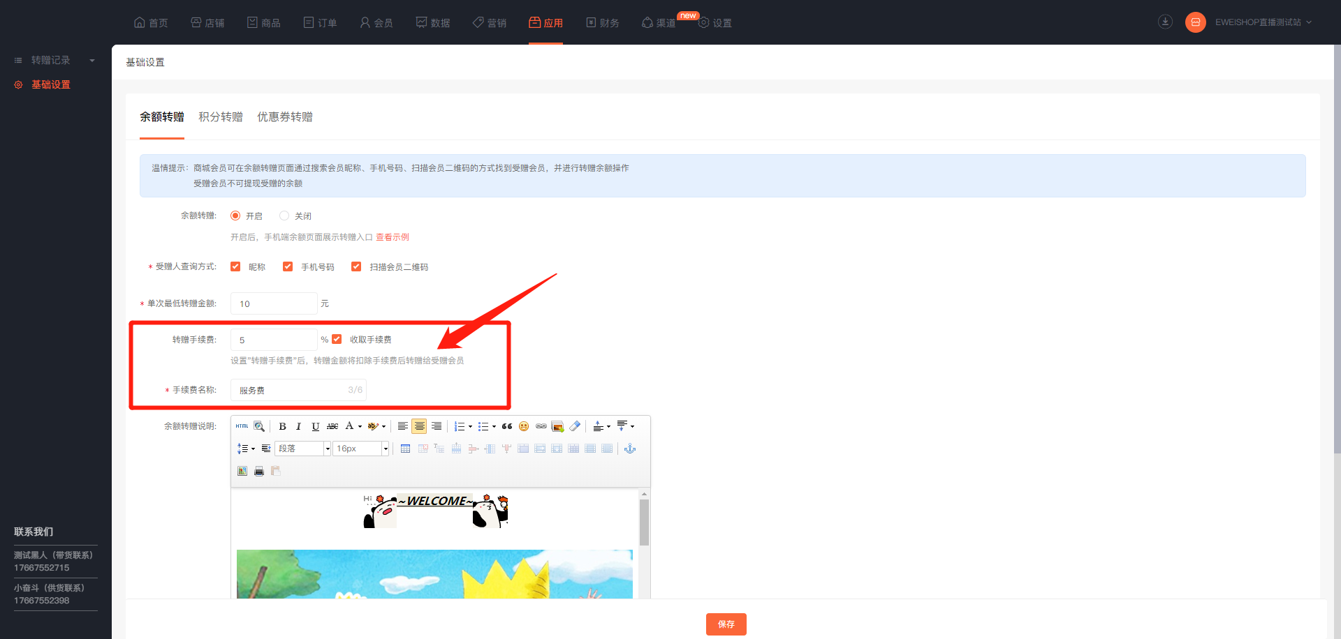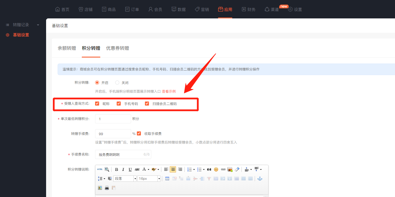 可根据需求自定义手续费的名称和费率,会员转赠资产时,系统将自动扣除手续费后转赠给受赠人账户。
