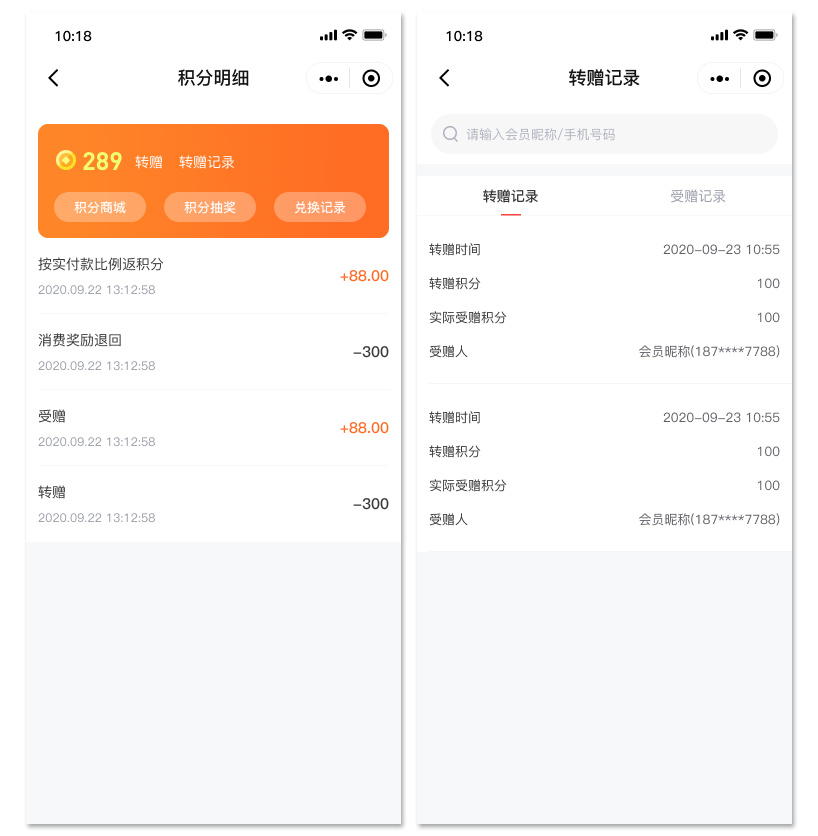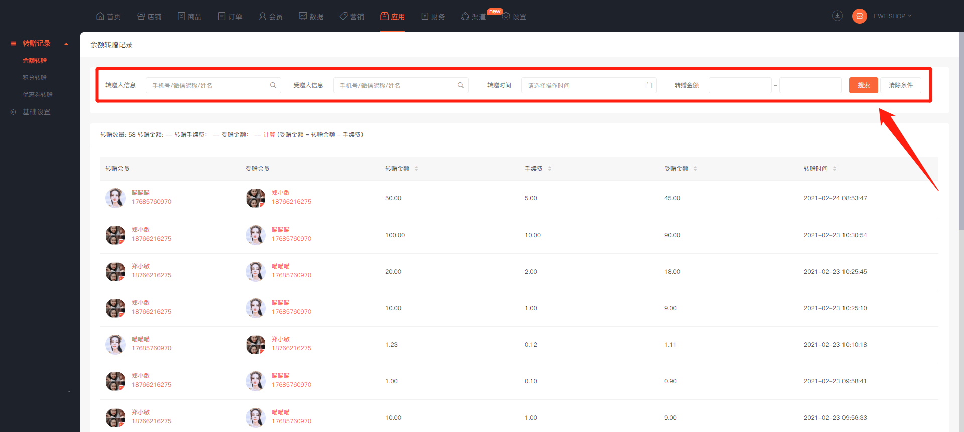 商家可根据手机号、会员昵称、姓名、时间、额度等条件筛选查看详细的转赠记录,方便快捷。