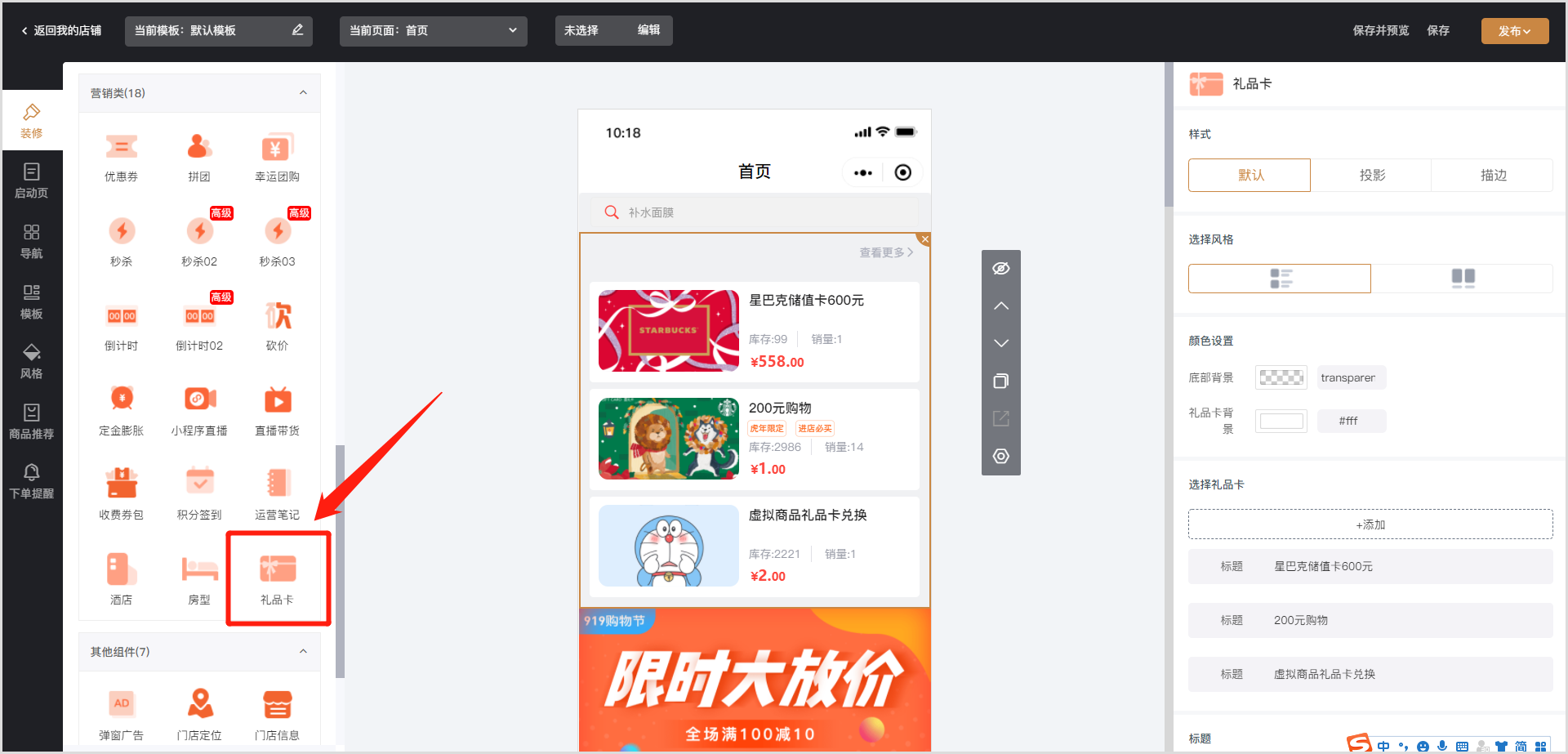 新增“礼品卡”装修组件