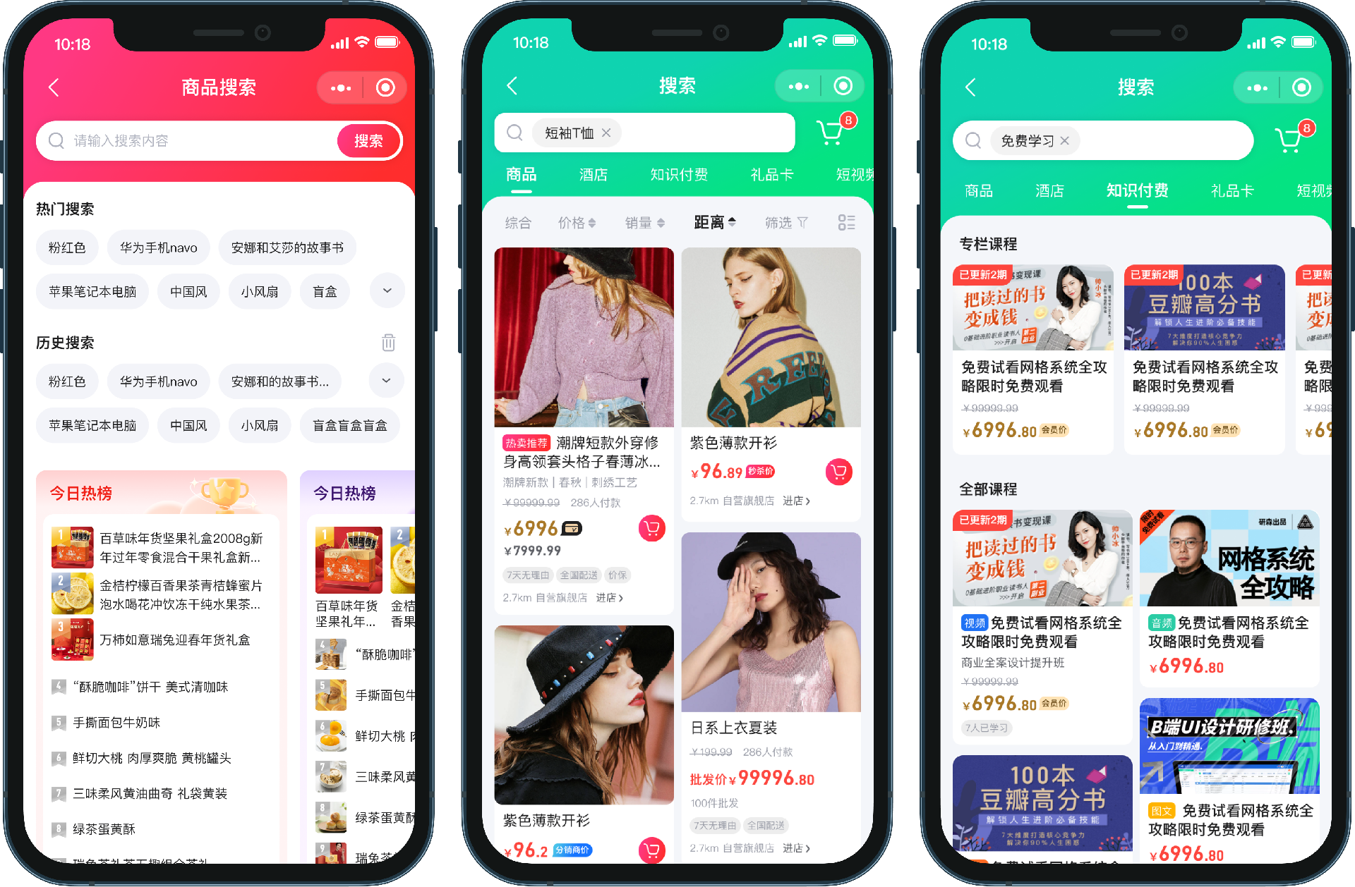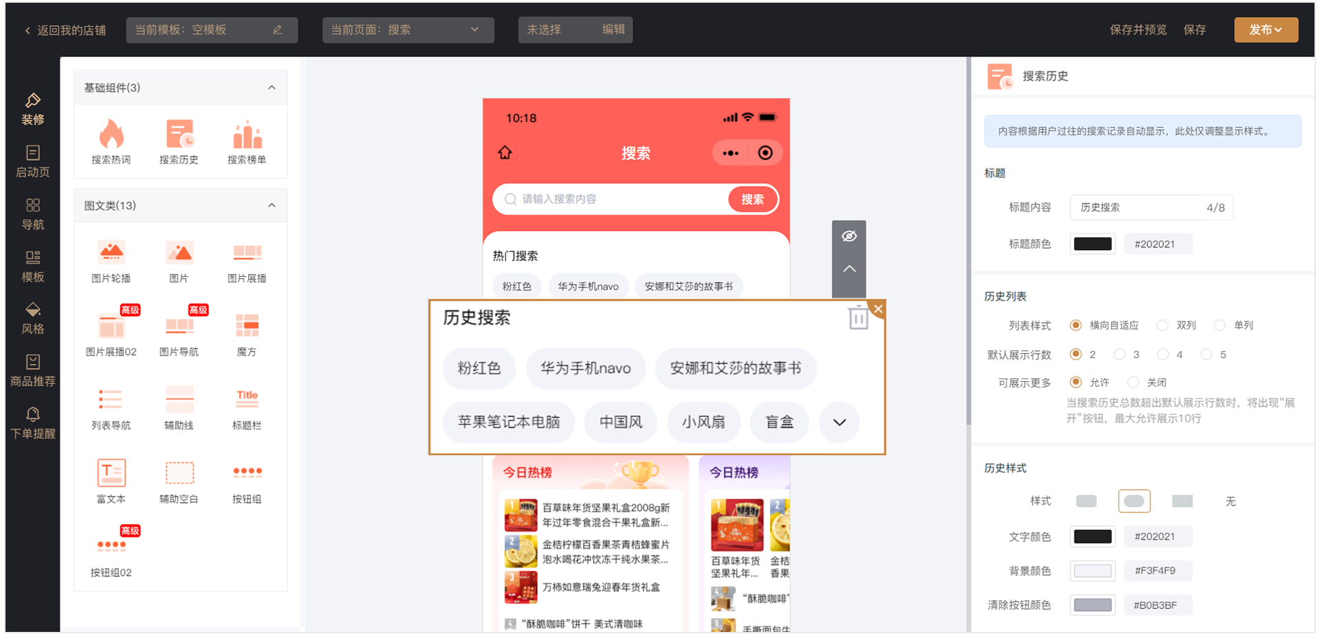 该页面包含3个基础组件,及十余个图文类装修组件,您可以灵活装修出一个功能丰富的搜索页面。