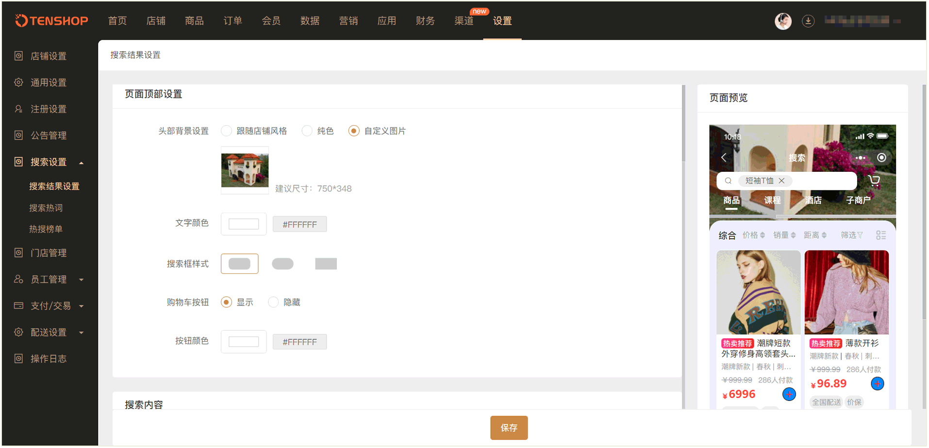 3.当页面头部开启了搜索框后,可设置是否显示搜索热词及搜索按钮。