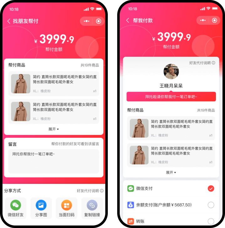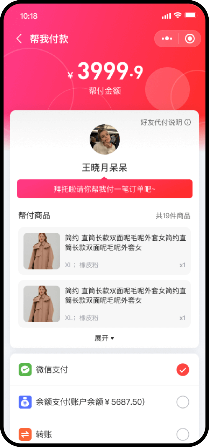 让代付发起者与帮付者形成互动,满足顾客的社交需求,增加趣味性。