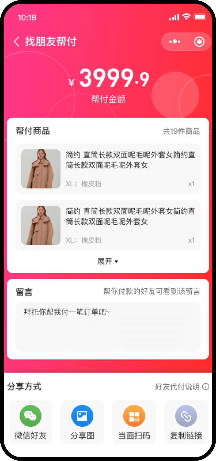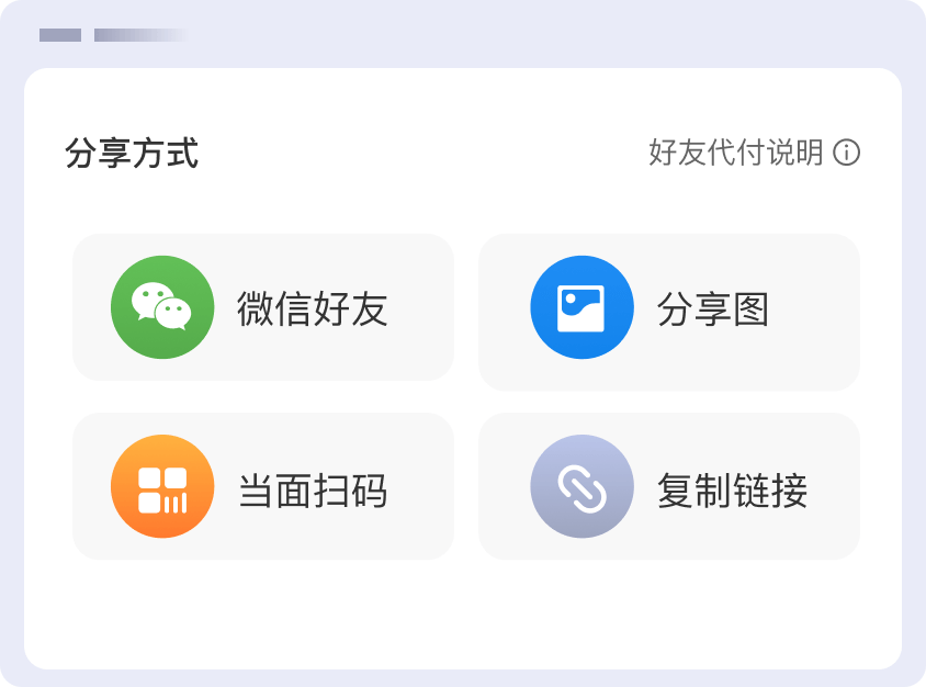 可以将代付链接直接发给微信好友,或通过分享图、当面扫码或复制链接的方式让好友进行支付。
