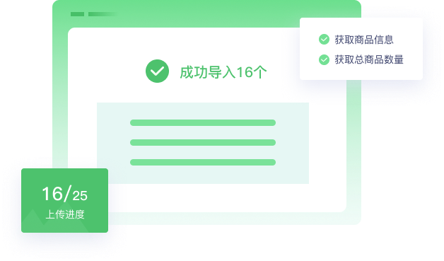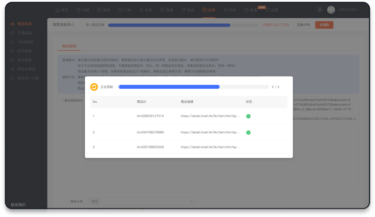 可批量导入商品信息,展示商品获取进度,获取完成后展示已成功获取商品数量和总商品数量。