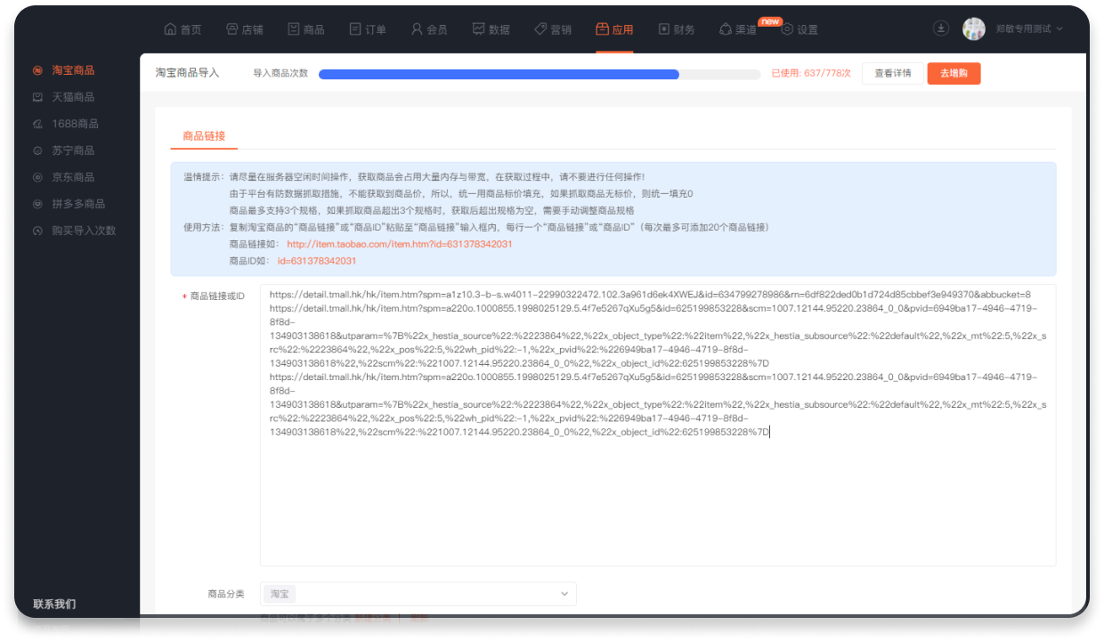 目前可支持淘宝、天猫、1688、京东、拼多多、苏宁六大电商平台内的商品导入。