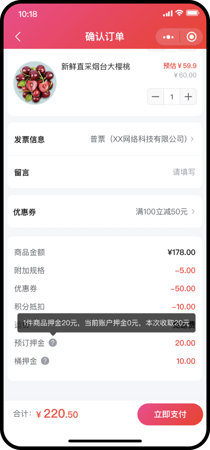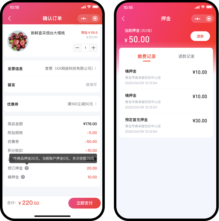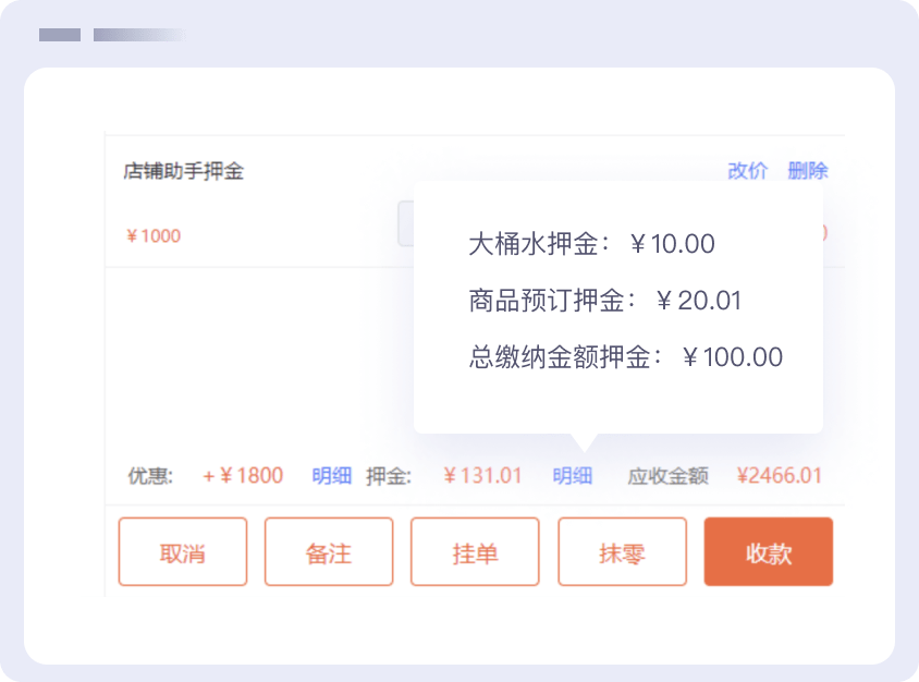 不同商品可以设置不同的押金金额与押金支付方式,支持按商