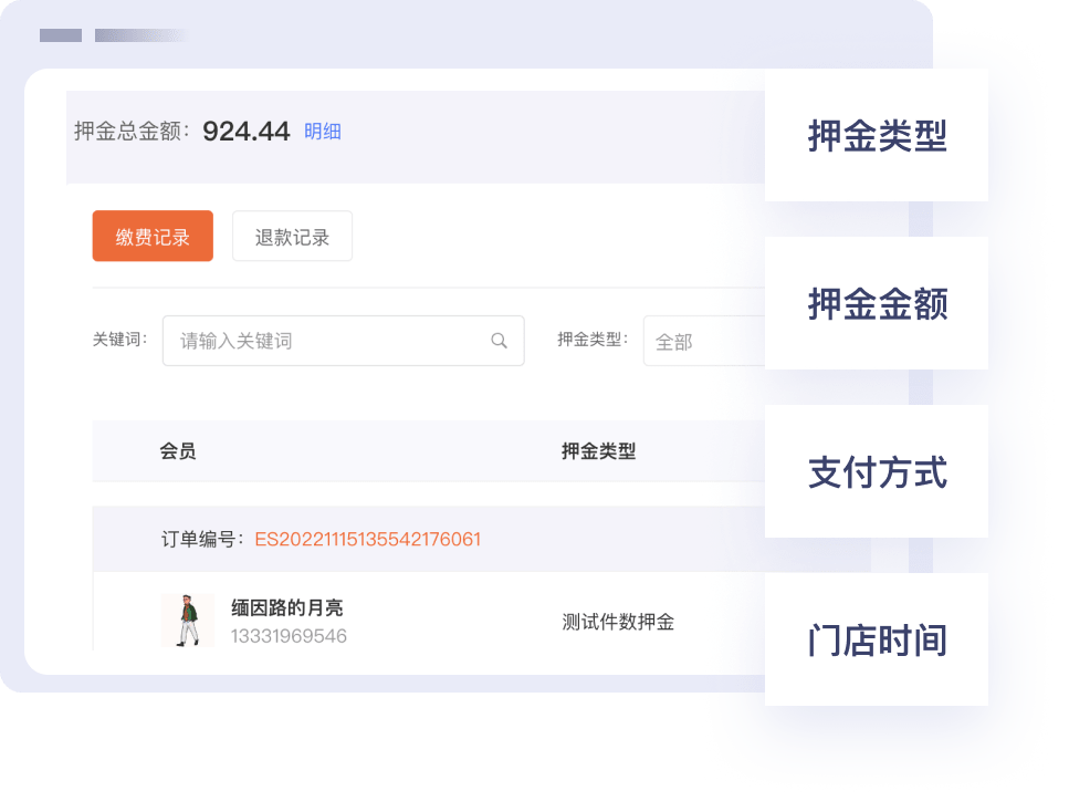 支持查看所有会员的押金缴费记录,包含缴纳押金的类型、金额、